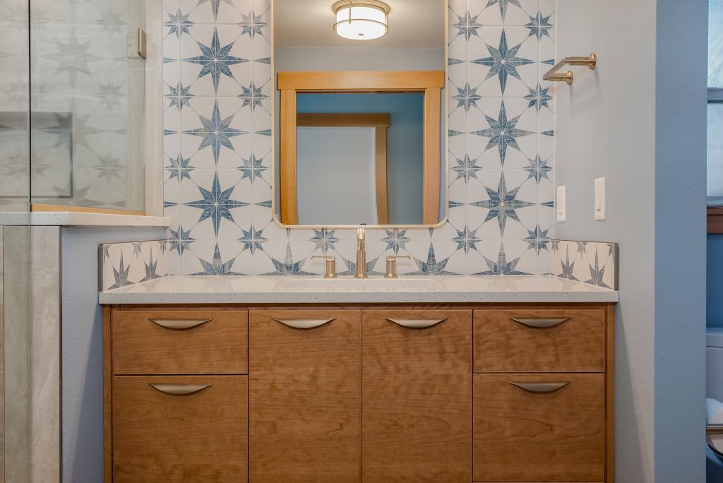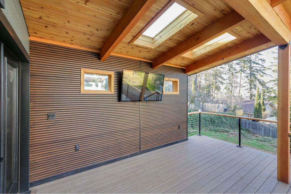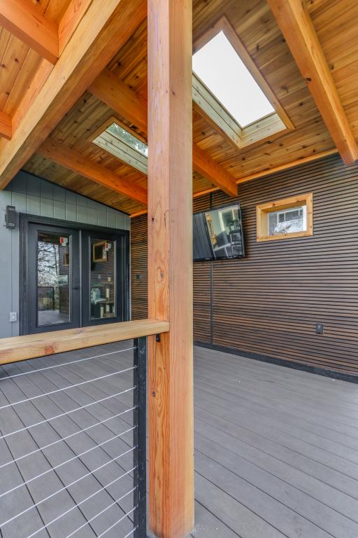 This custom remodel and outdoor living project was designed to create a seamless connection between interior comfort and year-round outdoor enjoyment. Exposed timber framing, tongue-and-groove ceilings, and skylights bring warmth and natural light to the covered deck, while integrated media and modern railing systems elevate functionality and style. Inside, custom built-ins, handcrafted cabinetry, and thoughtfully detailed bathrooms showcase precision craftsmanship and timeless materials. Every element was carefully executed to deliver a refined, highly livable space tailored to the homeowners’ lifestyle.